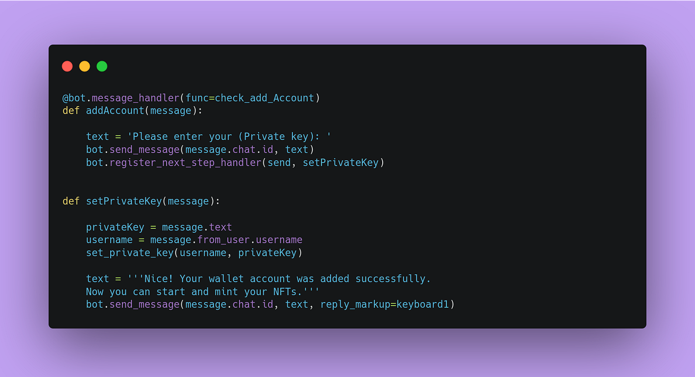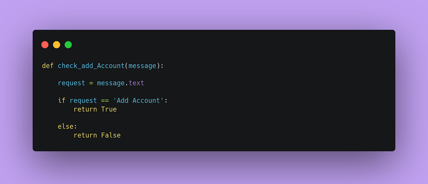 As you see in image above, we get a message from the user and check if it was equal to add account, then (addAccount in main.py) function will run. Now you can go ahead and implement all other functions easily.