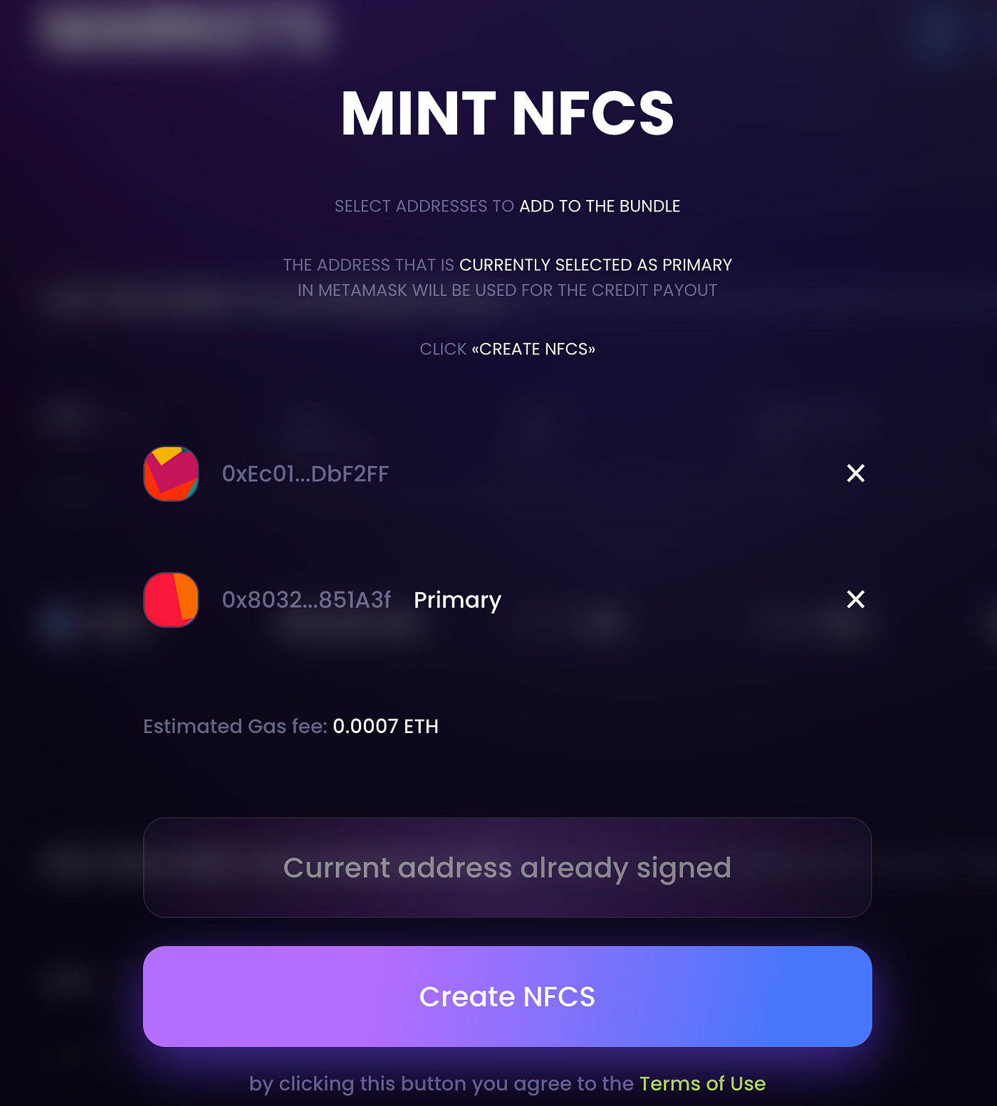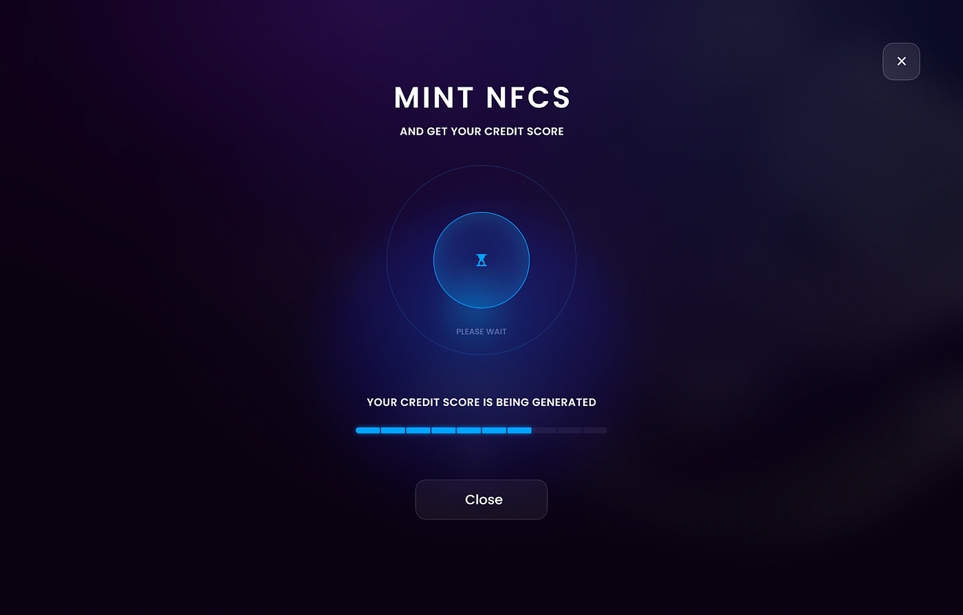 In order to receive a CS, users must mint their Non-fungible Credit Score (NFCS) token first. NFCS is an ERC-721 token that is minted on the Polygon blockchain and is used to verify ownership of the addresses for which the credit risk score (CS) has been generated.